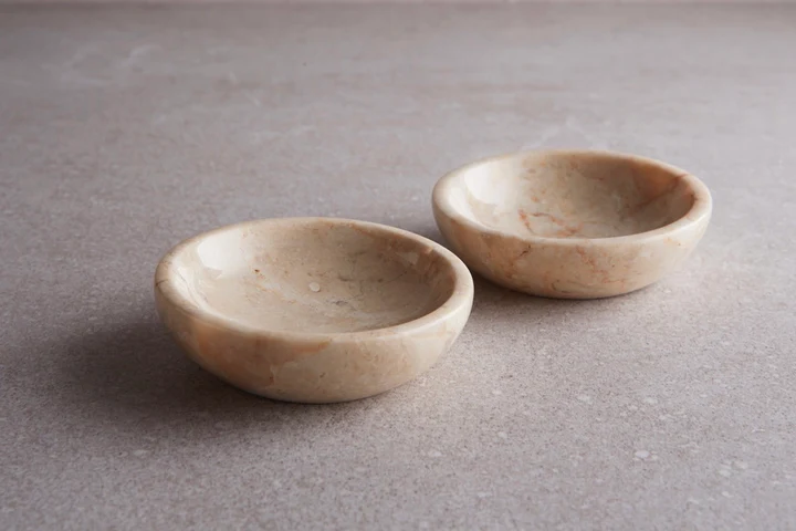 This marble sauce dish is great for table spices or condiments. Because each is handmade and unique, the color/grain pattern may differ from the photo. Dimensions: Diameter: 2.75in Height: .75in Price is for one sauce dish.