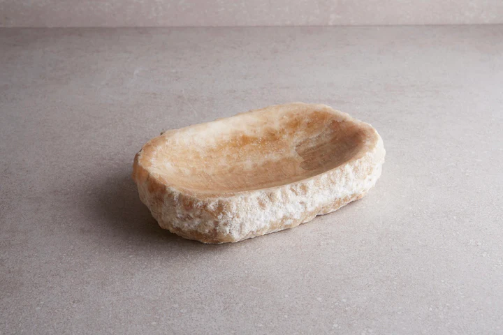 This organic onyx dish has a smooth bowl with the rough stone sides. The bottom has been sanded so it sits flat. Each dish is handmade and unique so color and grain patterns may differ from what is in the photo.